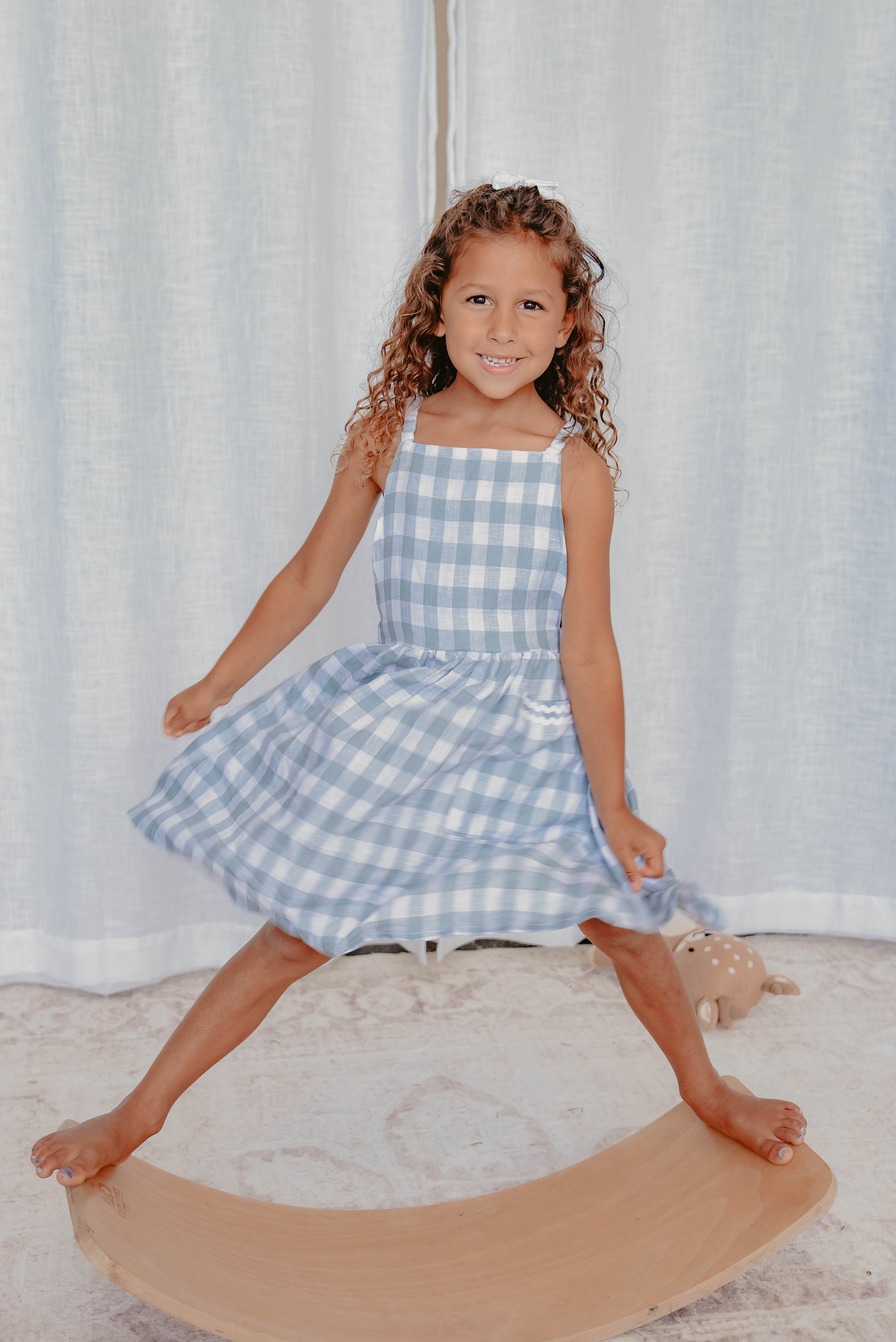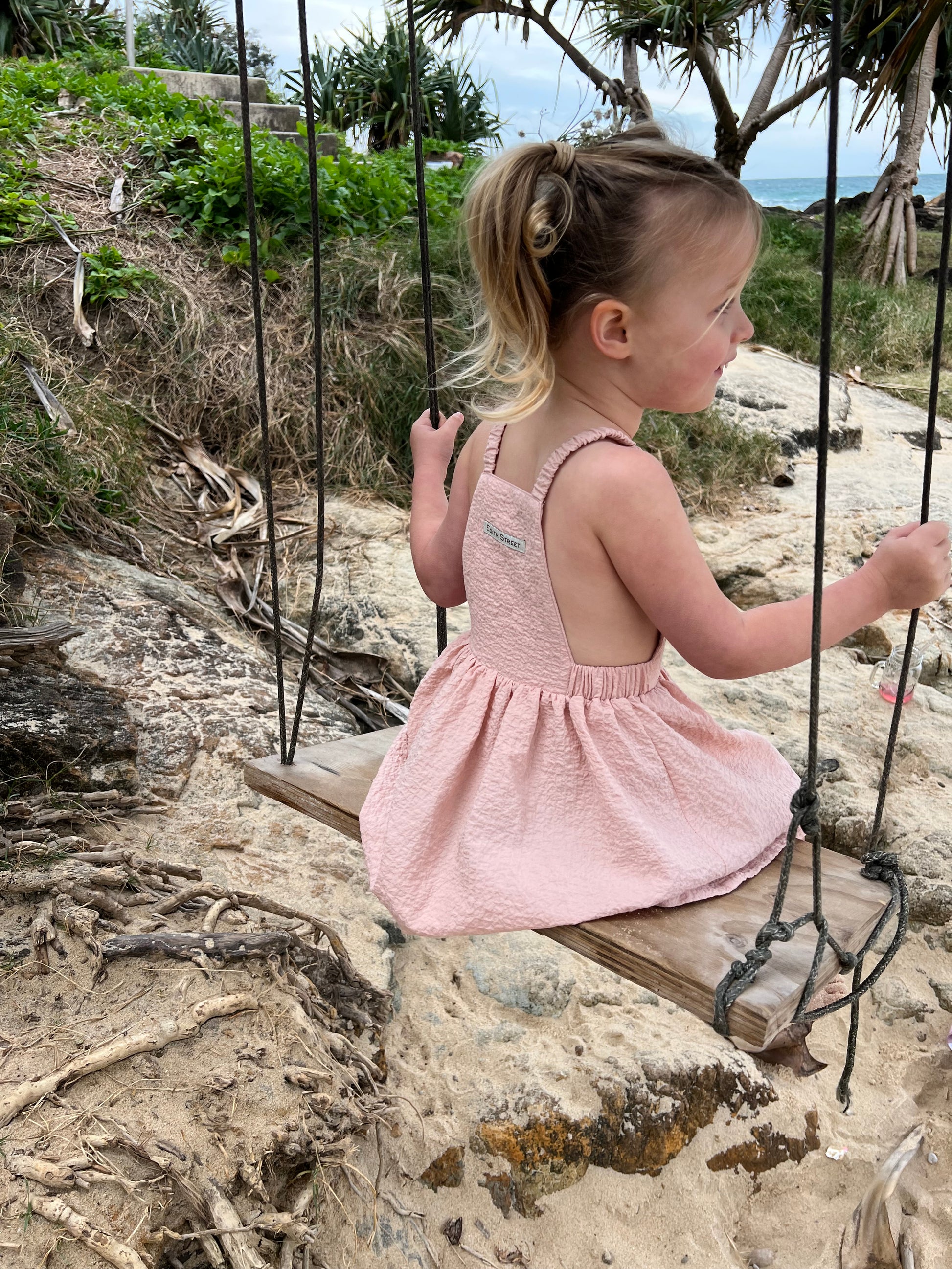 The Haven dress features elastic at the waist and over the shoulders making it super easy to pop on and off. The striking back bib detail gives added cuteness to this versatile little dress along with a small pocket on the front.