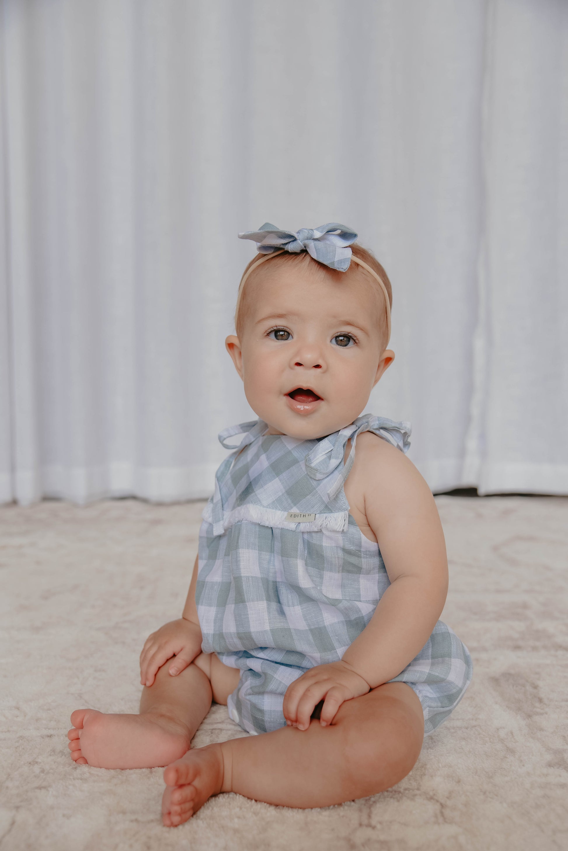 The Maisie Mae romper is easy to wear and comfy enough to play all day, while looking oh so cute!The body of this sweet Maisie romper style gathers onto the feature yoke. The romper ties softly at the shoulders. A soft cotton fringing or ric rac detail ties it all together. This romper has press studs to allow for easy accessibility whilst taking on and off.